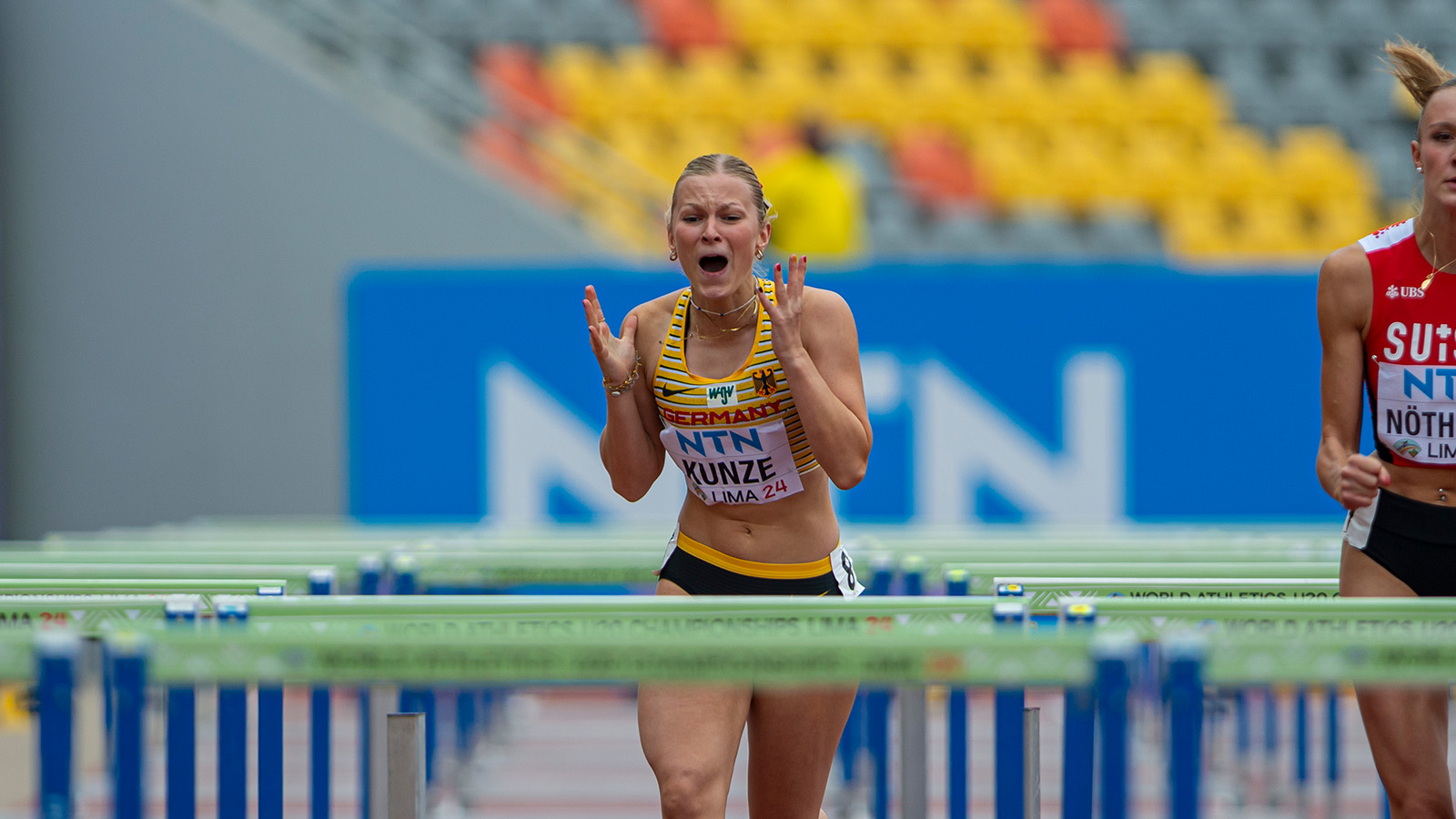Kurz darauf unterlief auch Lilly Kunze ein Malheur. Sie blieb mit dem Nachziehbein an der siebten Hürde hängen, kam aus dem Tritt, bremste händeringend ab und lief noch über die Ziellinie, nachdem sie eine Hürde mit der Hand umgestoßen hatte. Später wurde sie wegen nicht ordnungsgemäßer Hürden-Überquerung disqualifiziert. "Für Lilly ist das sehr bitter, das Halbfinale wäre möglich gewesen", sagte Nachwuchs-Bundestrainer Rico May.