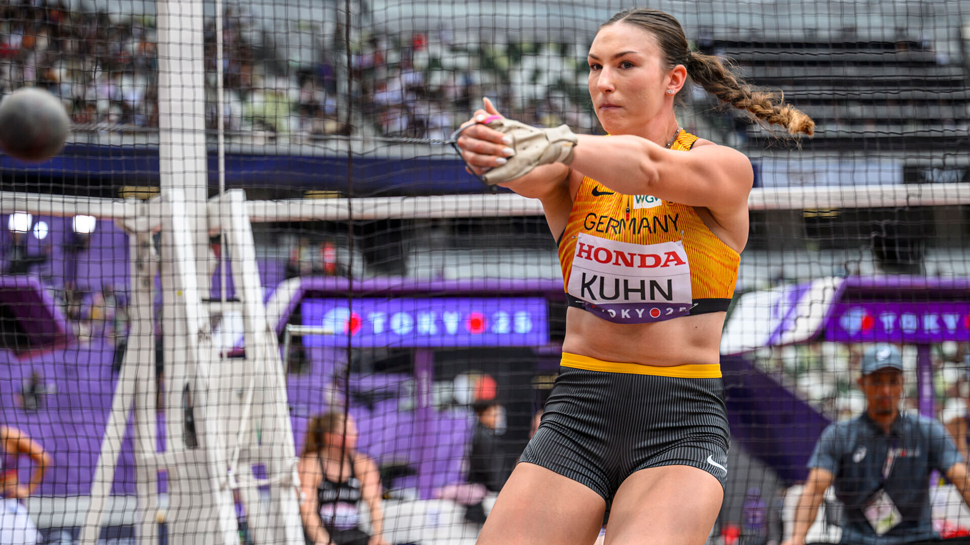 Hammerwerferin Aileen Kuhn (Eintracht Frankfurt) steht mit 21 Jahren in ihrem ersten WM-Finale! Die U23-Europameisterin startete in der Qualifikation mit einer 69-Meter-Weite, auf der sie im zweiten Durchgang aufbauen konnte: 70,85 Meter brachten Aileen Kuhn auf einen Qualifikationsrang. Als zwischenzeitlich Zehnte konnte sie sich ihrer Sache jedoch noch nicht sicher sein, insbesondere da eine ganze Reihe Athletinnen mit Weiten zwischen 68 und 72 Metern auf einen Finalplatz lauerten. Der dritte Wurf der Frankfurterin war dann ungültig, doch als Elfte reichte es dennoch fürs Finale. Ein großer Erfolg für eine der jüngsten Werferinnen im Feld.