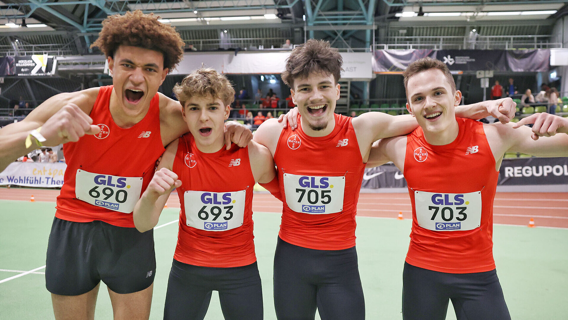 Die erste Entscheidung der Jugend-Hallen-DM zog sich über neun Zeitläufe. 31 Staffeln hatten für die Meisterschaften gemeldet. Im vierten Lauf setzten die Gastgeber ein erstes Ausrufezeichen: In 1:28,58 Minuten brachten Dmitrij Krom, Jannis Gartmann, Nils Haumann und Luke Schmidt das Staffelholz über die Ziellinie. An dieser Zeit bissen sich die Gegner erst einmal die Zähne aus. Bis zum letzten Lauf, in dem mit dem "All-Star-Team" des TSV Bayer 04 Leverkusen und den Titelverteidigern von Eintracht Frankfurt die beiden großen Favoriten ins Rennen gingen.